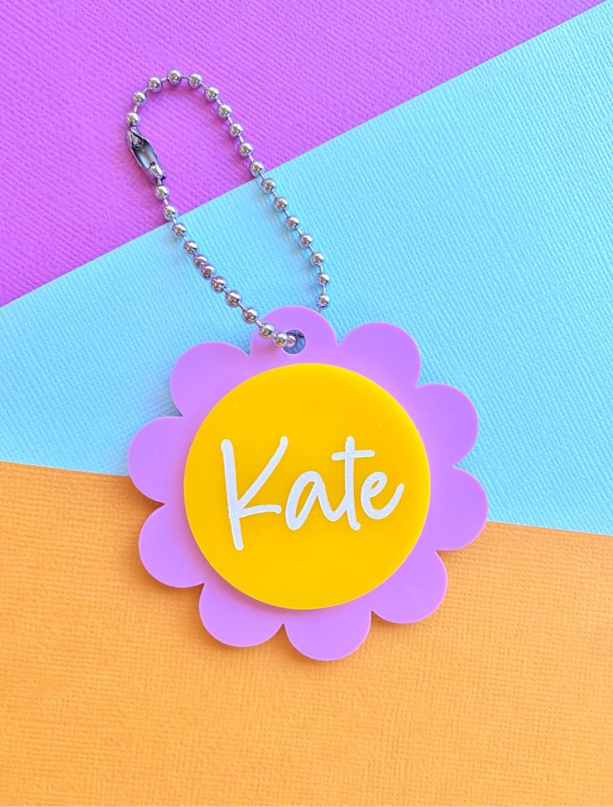 Custom daisy tag - Etched and painted custom name - Cute daisy design - Comes with silver ball chain - Choose from a wide range of colours - Great for keys or as a bag tag